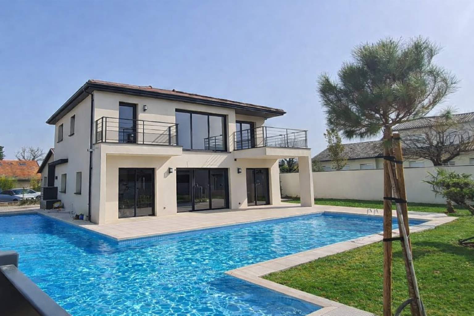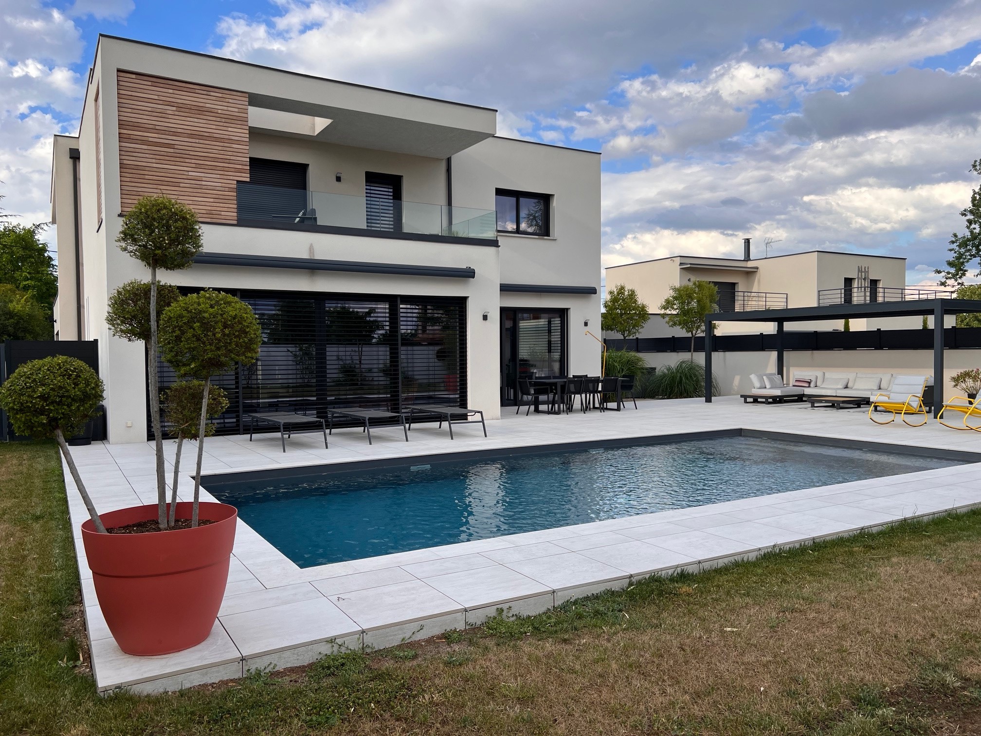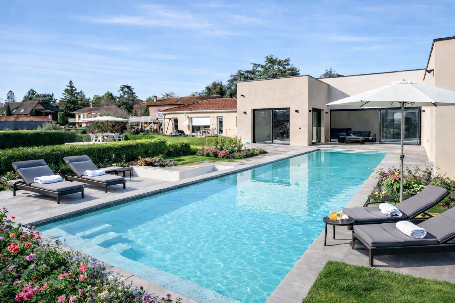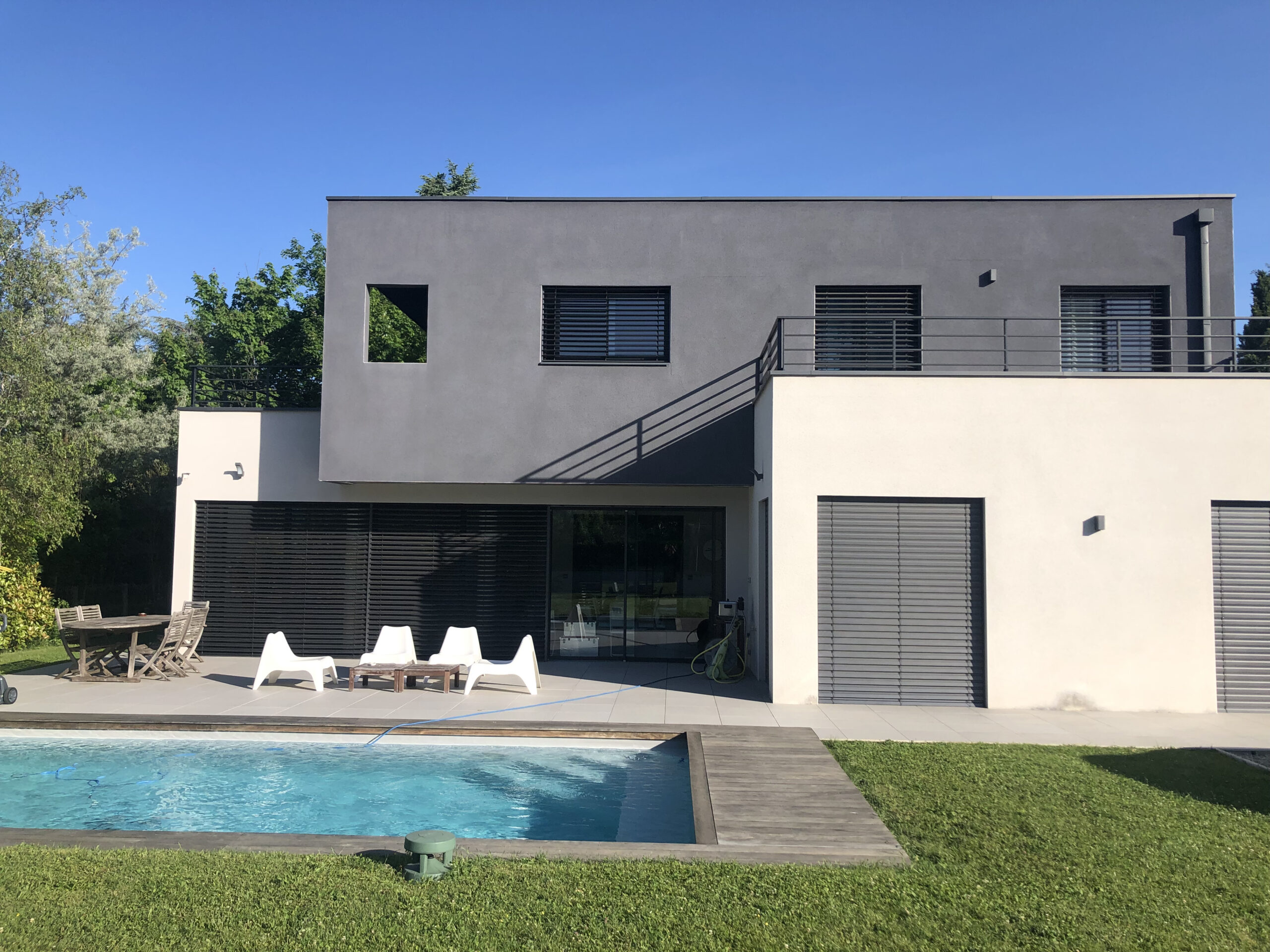 Nous avons accompagné la réalisation complète de ce projet de maison individuelle avec piscine à Chaponost, en France, en apportant une expertise globale en architecture résidentielle, design intérieur et aménagement d’espaces à chaque étape du chantier.